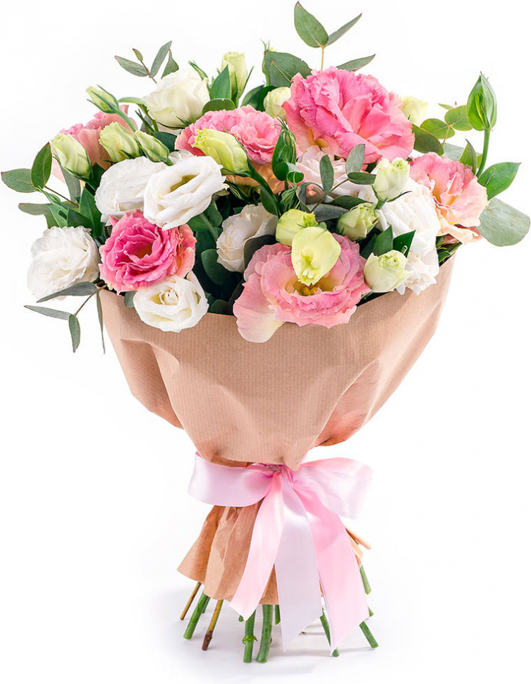 2 белого лизиантуса, 1 розовый лизиантус, эвкалипт, упаковка, лента3 белого лизиантуса, 2 розового лизиантуса, эвкалипт, упаковка, лента5 белого лизиантуса, 4 розового лизиантуса, эвкалипт, упаковка, лента